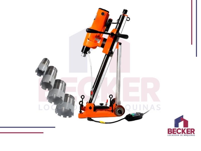 A Perfuratriz tem capacidade de perfuração de até 205 mm utilizando Brocas Diamantadas, contendo refrigeração à água pelo interior das brocas, duplo comando operacional no corpo da furadeira e no cabo elétrico, suporte reclinável. Contando com acessórios inclusos de brocas diamantadas de 50 mm até 250 mm.